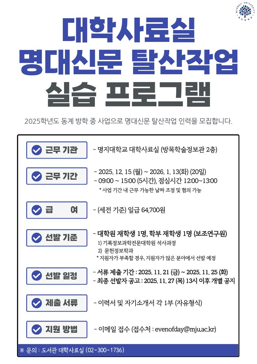2025학년도 동계방학 인문캠퍼스 도서관 대학사료실 실습장학생을 다음과 같이 선발하오니 많은 지원바랍니다.