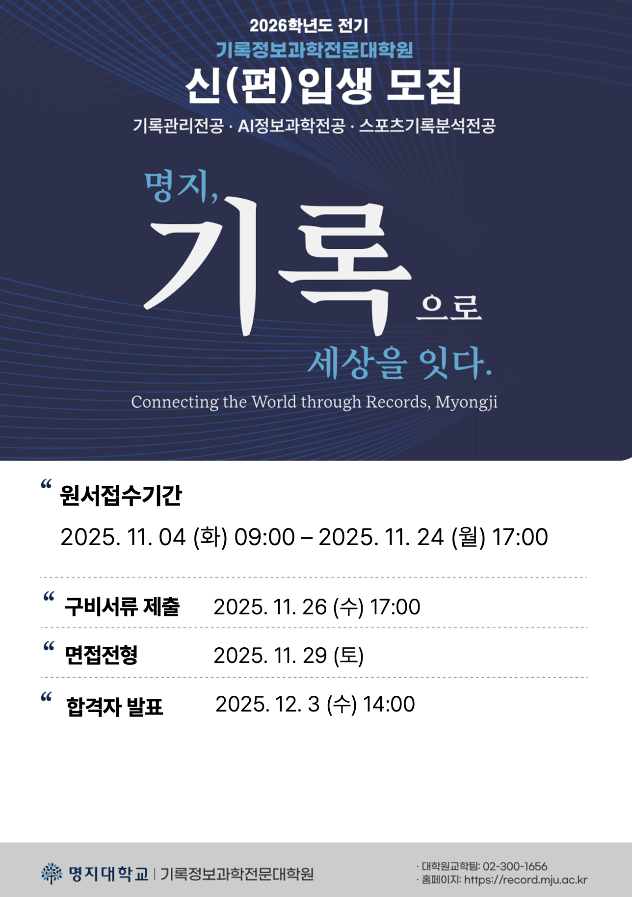 2026학년도 전기 기록정보과학전문대학원 입시설명회2026학년도 전기 기록정보과학전문대학원 입시설명회 명지대학교 기록정보과학전문대학원에서2025.10.28.